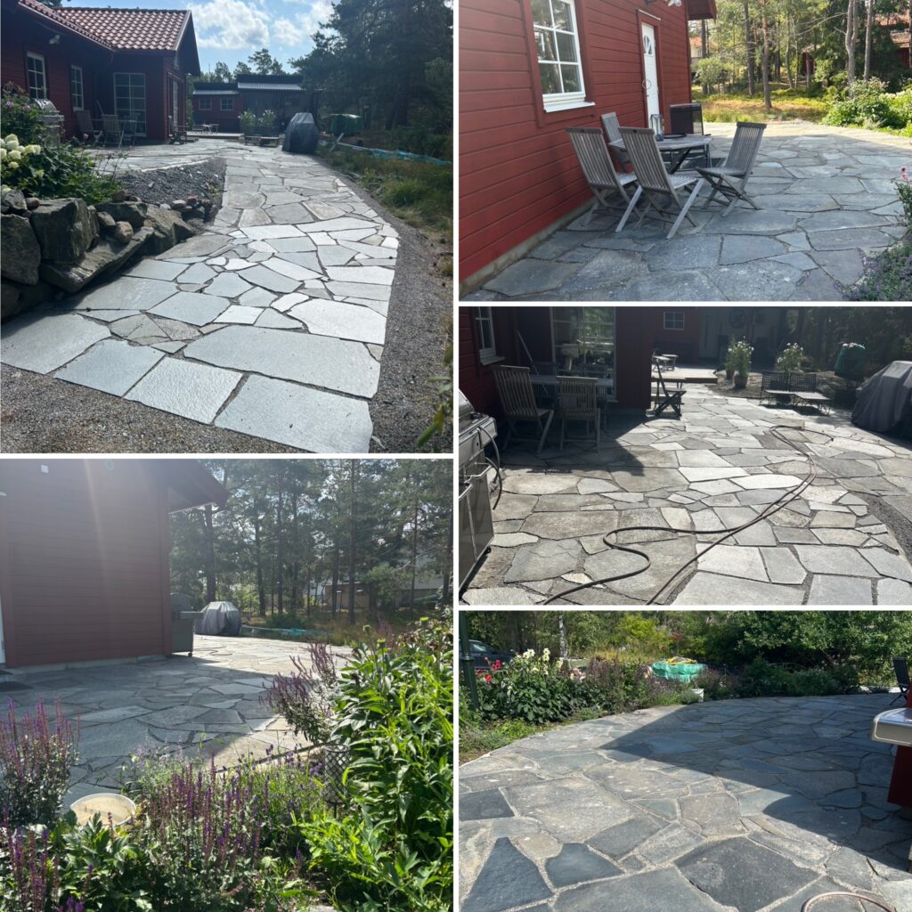 Stort markjobb på Älgö med huggen offerdalsskiftter runt huset, lagd i stenmjöl med osynlig betongkant.